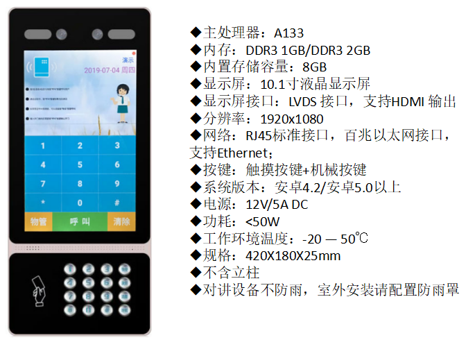 1、通过触摸屏或机械按键都可以操控主机,通过密码在主机进行包括音量,开锁密码,人脸识别启用等相关设置
